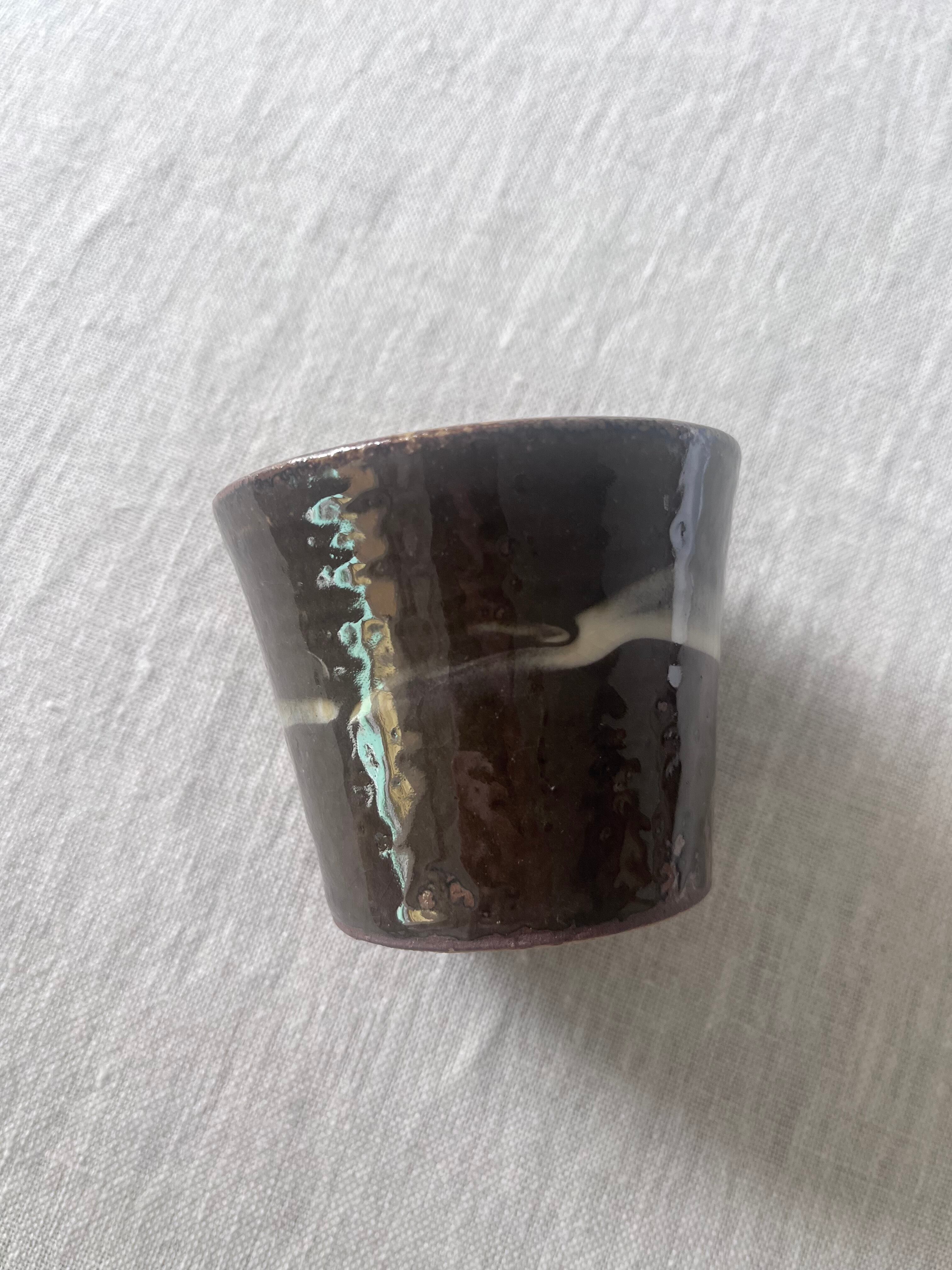 スリップウエアは山口さんの代表的な作品。山口さんのスリップは、シックでシンプルな絵柄。他のうつわと調和します。こちらは蕎麦ちょこサイズのカップ。焼酎のロックやサワー、トマト煮込みなど洋食の小鉢としても◎