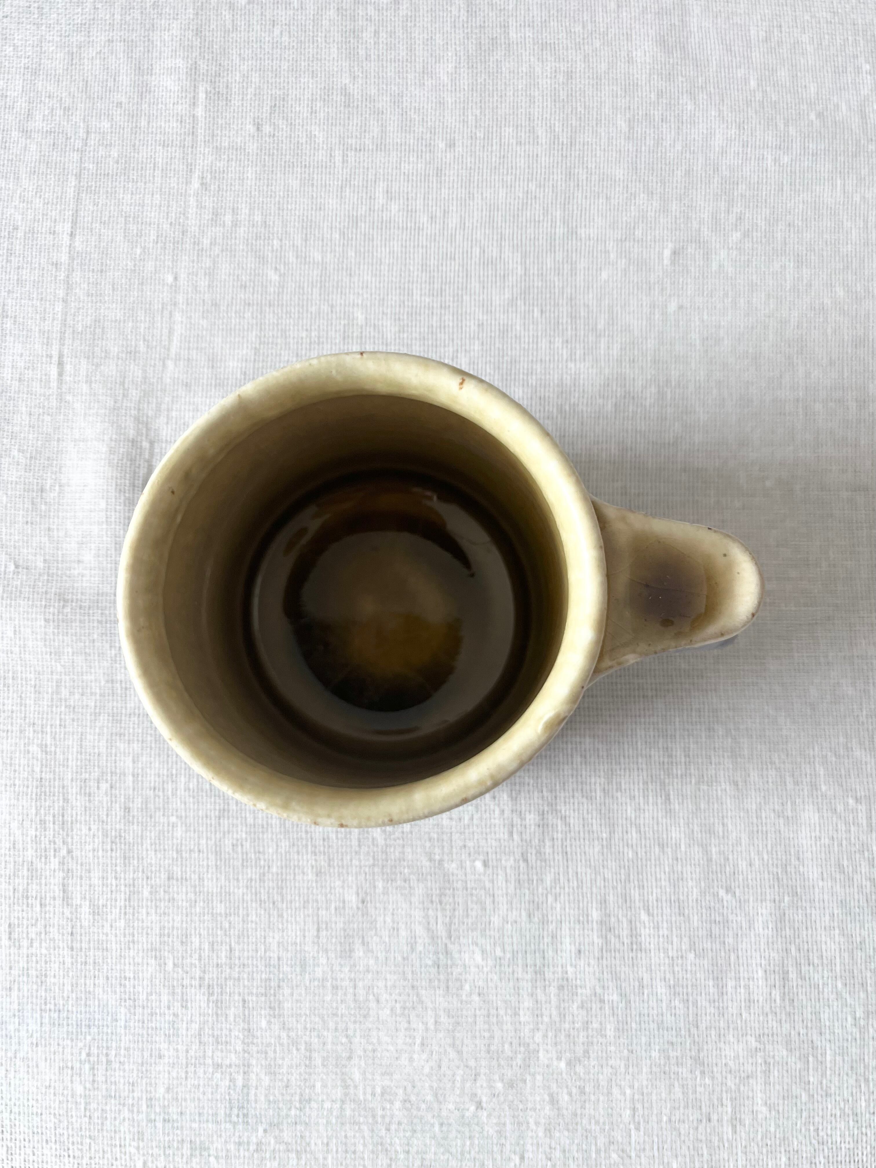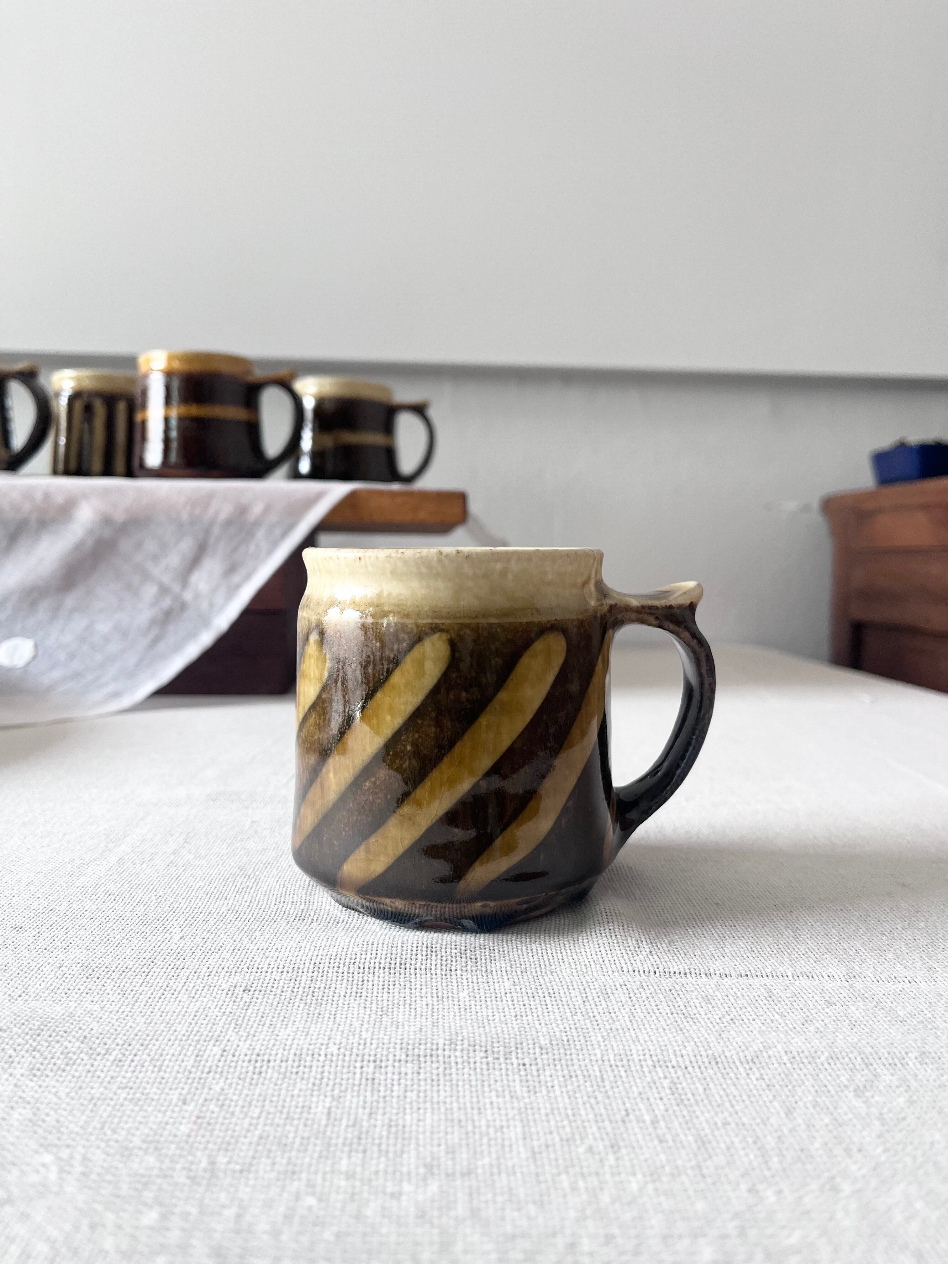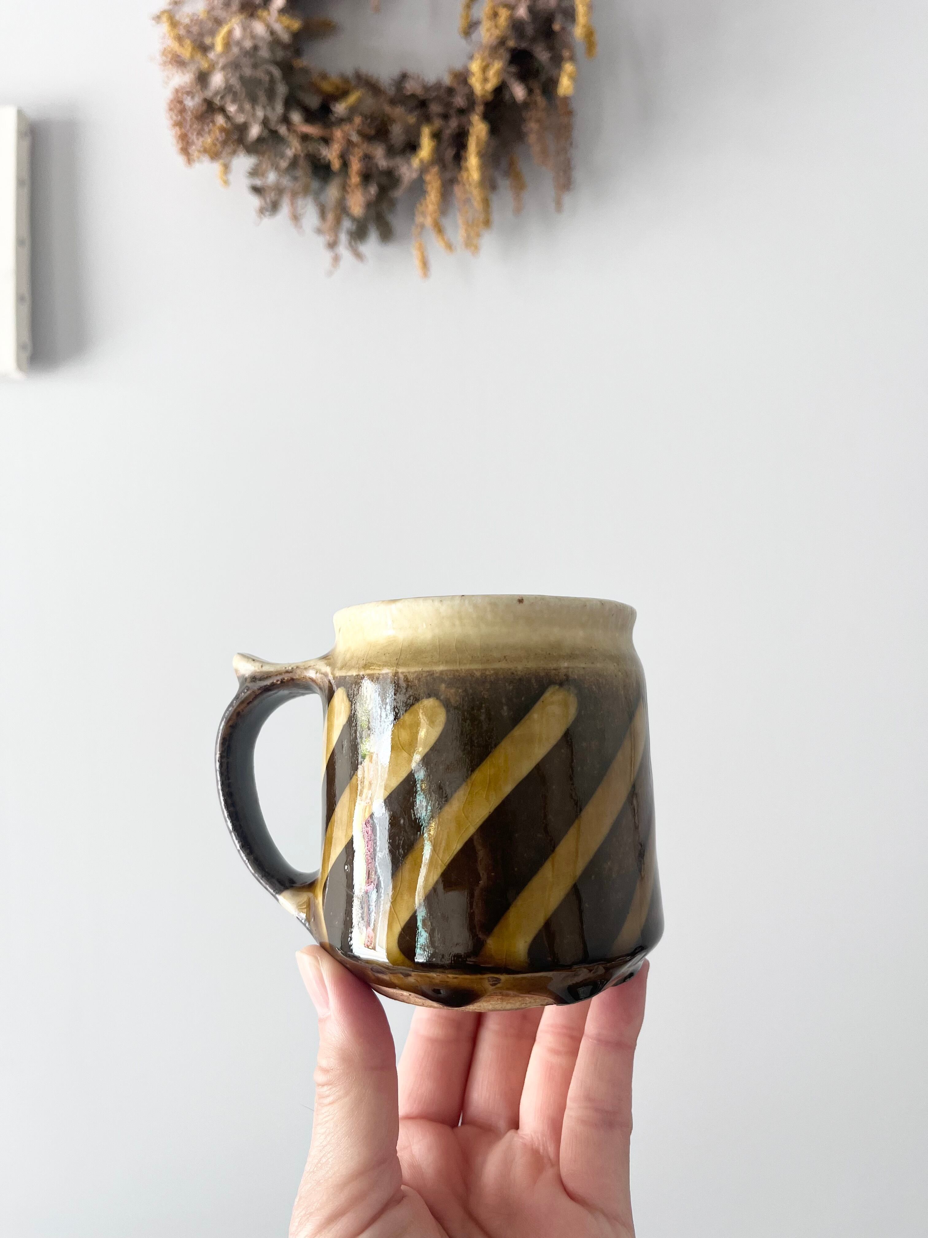 取手に親指が置けて持ちやすいデザイン。ヨーロッパの古い陶器のような雰囲気のマグカップ。マグカップ小①は、斜めの柄が優しく、魅力。コーヒーはもちろん、ビールにも◎