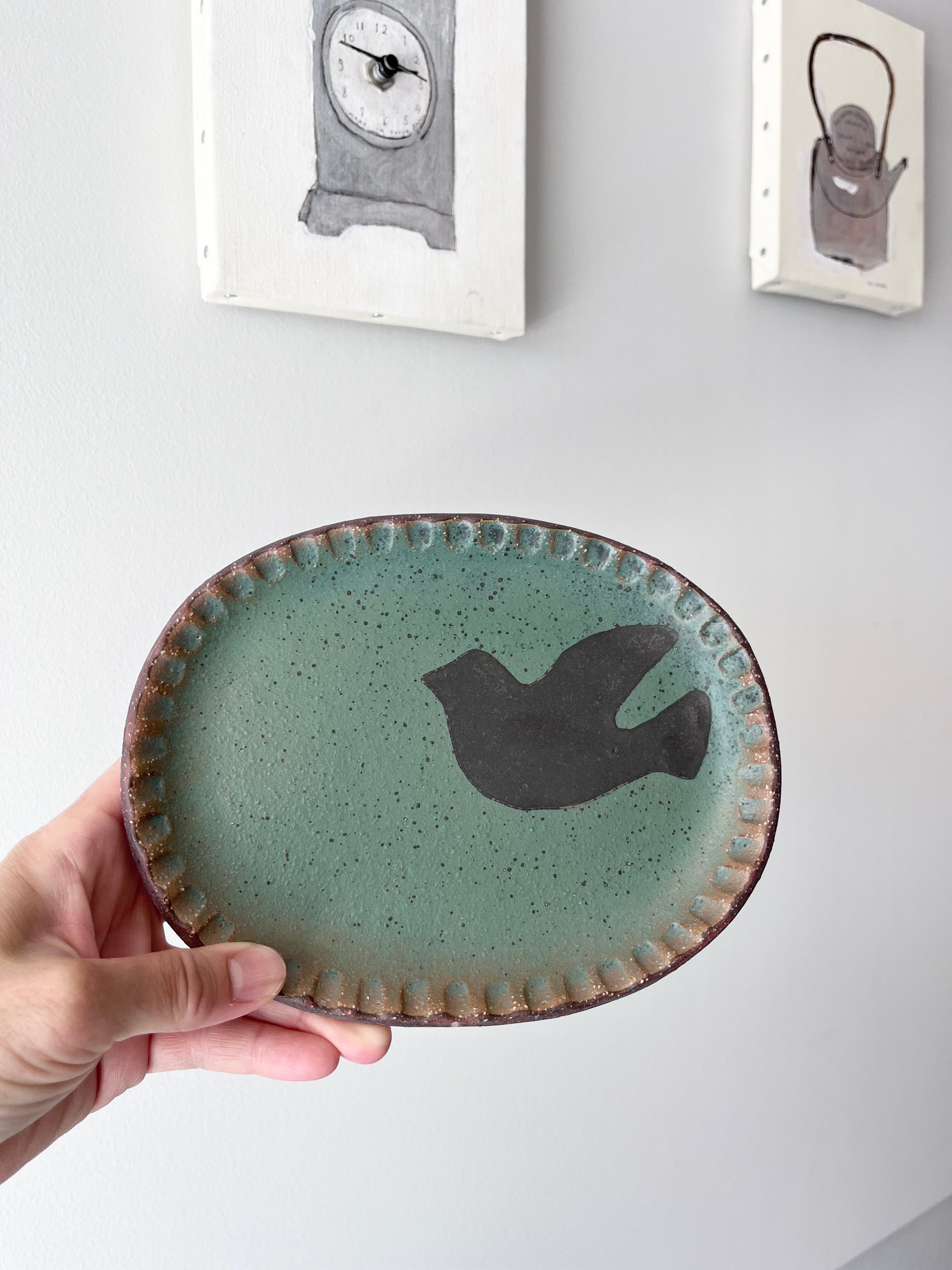 沖縄の陶芸家、工房ことりのさんのオーバルプレート、グリーン。