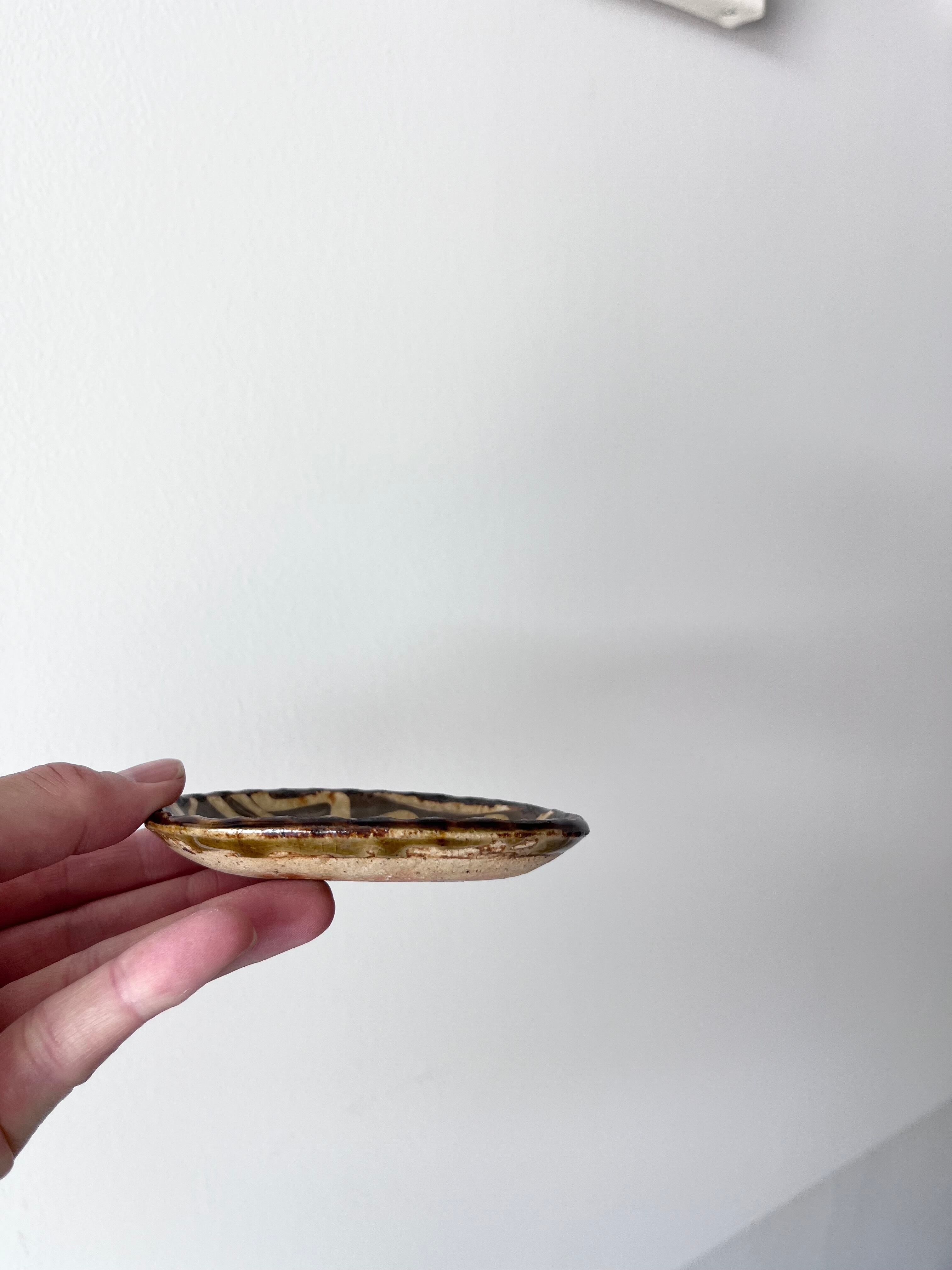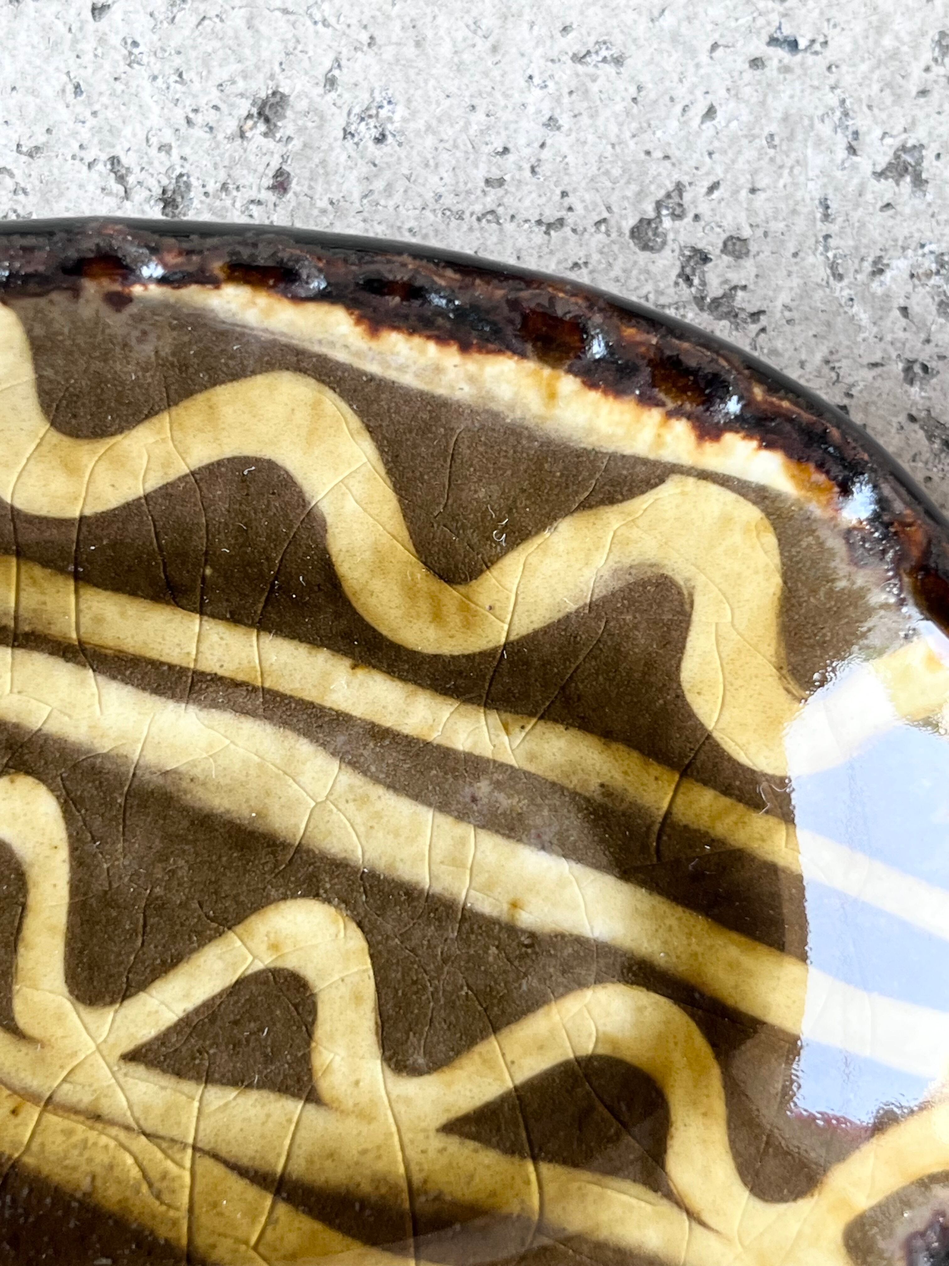 これぞ、山口さんの代表作!と感じる定番の作品の1つ。小さなお皿の中に描かれるスリップは、焼き色が美しく、こっくりと仕上がっています。おつまみのナッツ、おやつのチョコレートなどなど、小回りのきくうつわ。表面に細く線が入っていますが、こちらは焼いて後に冷めて出来るものですので、そのままお使いくださいませ。