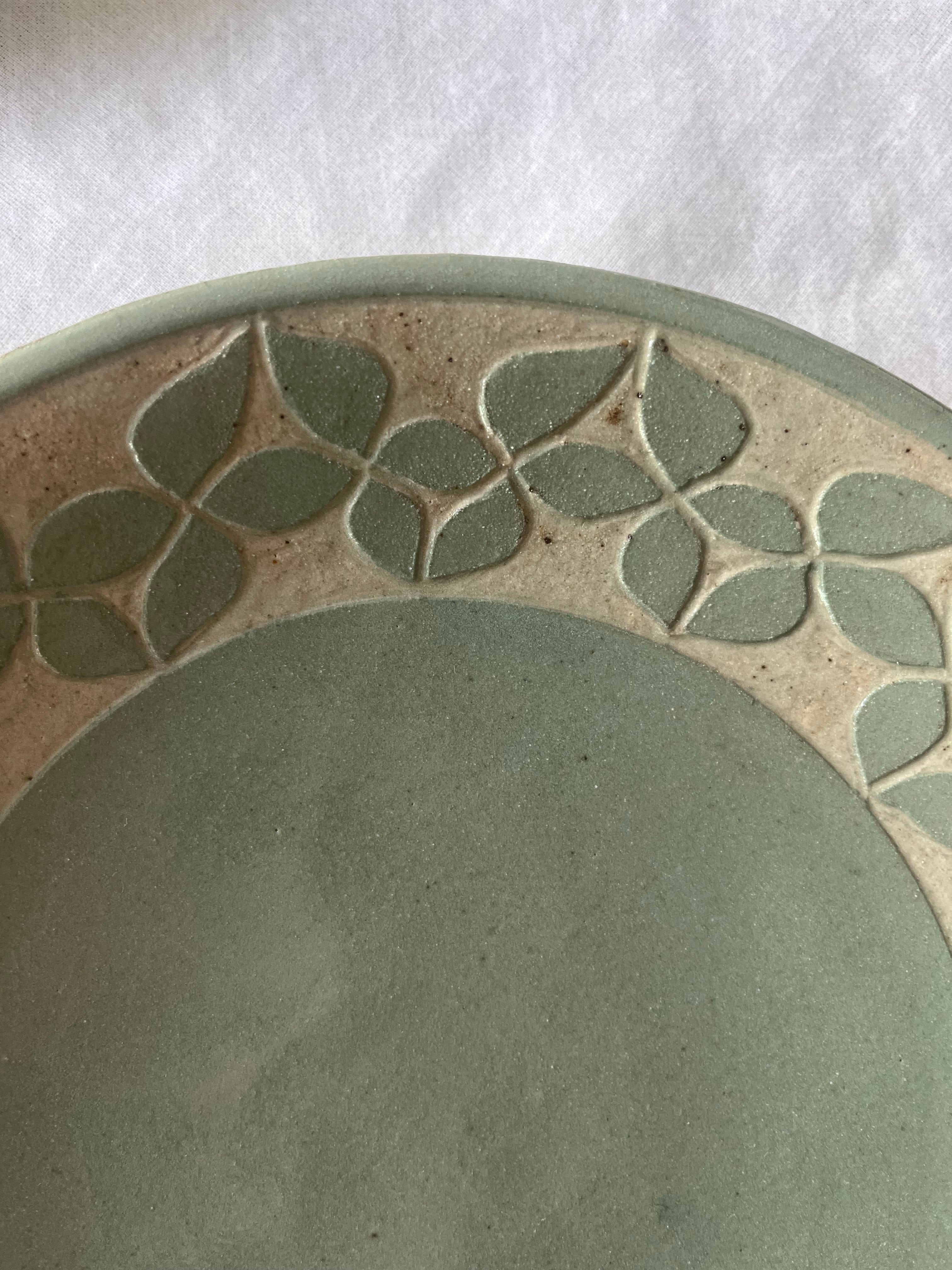 葉が揺れるような躍動感ある絵柄を、繊細な彫りと削りで表現。ぽってりとした土の感触が特徴です。