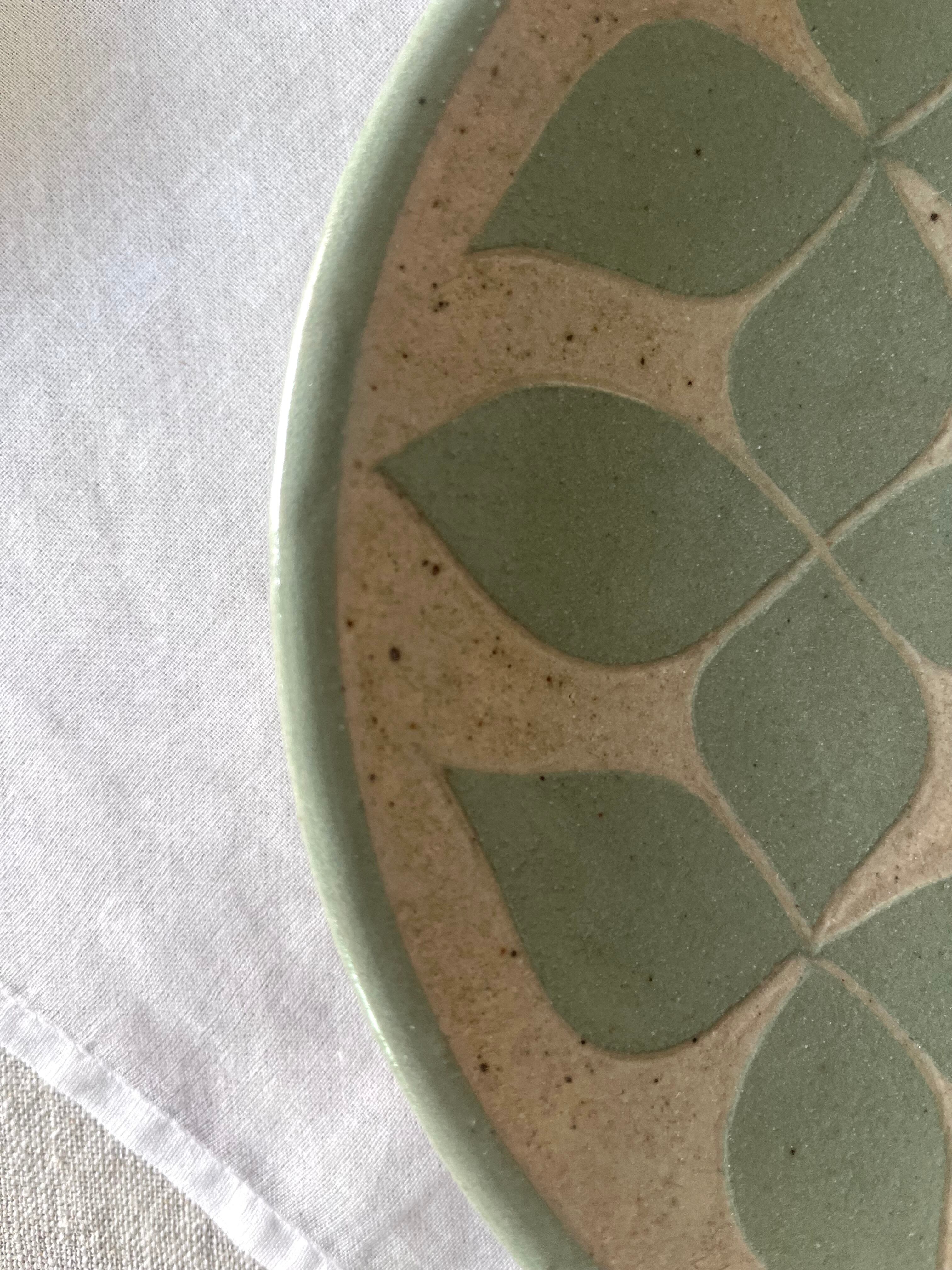 葉が揺れるような躍動感ある絵柄を、繊細な彫りと削りで表現。ぽってりとした土の感触が特徴です。